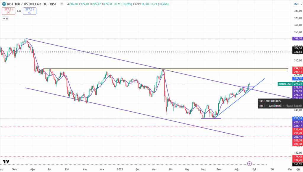 Dolar bazlıda da 200 günlüğün üzerinde hareketimize devam ediyoruz. İlk hedef 285$’ler demiştik ancak 283$’dan döndük ama sonrasındaki 295$ seviyeleri için desteklerimiz ise 273/270$lar olacak.