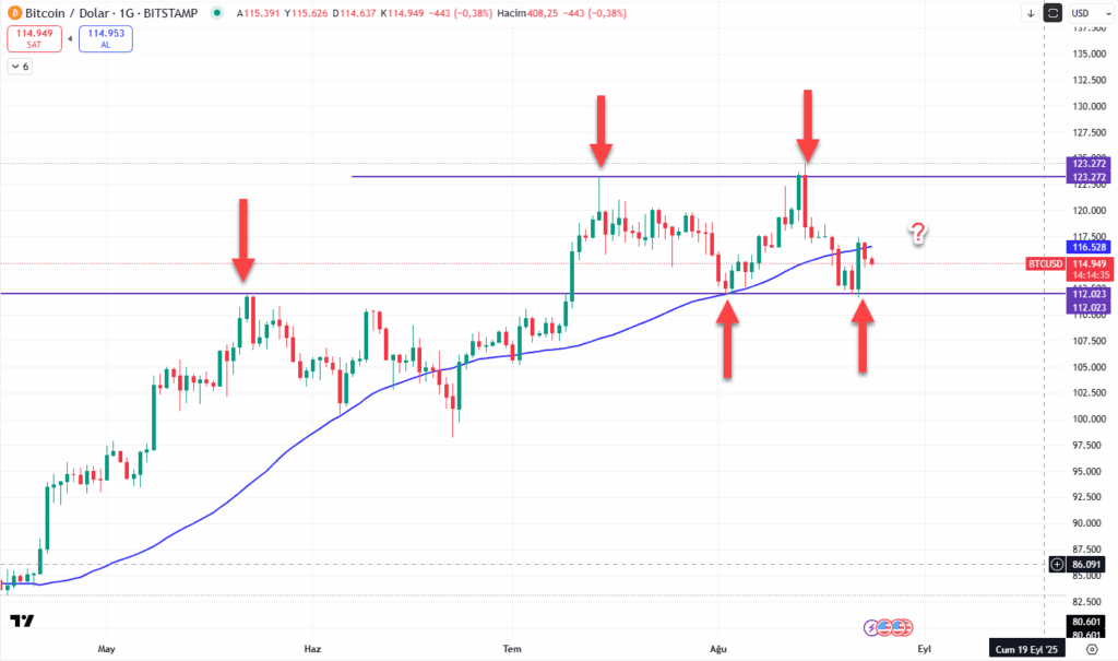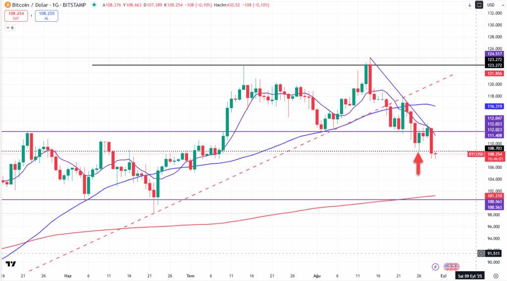 “Powell’ın açıklamalarına rağmen hafta sonu yukarı yönlü sert bir hareketin gelmemiş olması düşündürücü.” demiştik ve ardından 112/123bin$ bandı aşağıya kırılmış görünüyor. 108700 $ altında 100bin $ yolculuğu savı güçlenmeye başladı. (2. grafik)