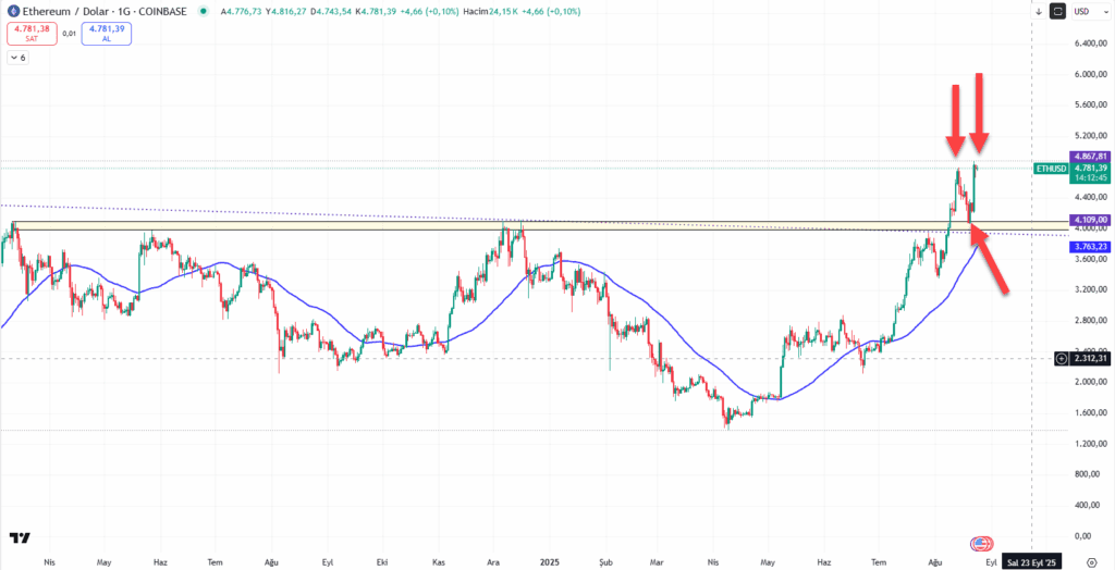 Geçtiğimiz hafta ne demişiz bir göz atalım: “Eski zirvesinin üzerine kısa süreli de olsa atabilen ve tüm zamanların en yüksek seviyesini gören Ethereum’da 4060$’lardan kitabına uygun bir pullback geldi. Ancak eski zirve seviyesinin üzerine tekrar gelmezse burada bir 2. tepe mi oluşuyor sorusu akıllara gelebilir.“