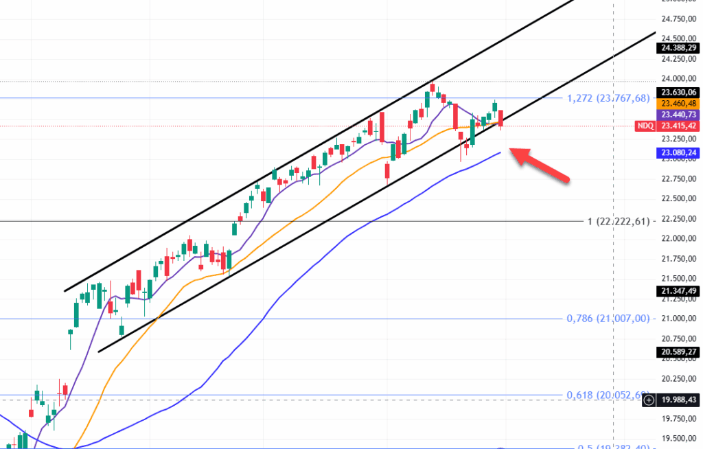 Endekste 8 günlük ortalamanın hemen altında(23440) kapanış geldi. Yükselen kanal ise tekrar tehdit ediliyor ve ilk desteğimiz yine 50 günlük 23080‘den geçiyor.