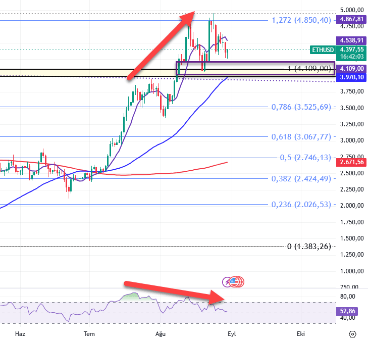Yeni grafiğe de hızlıca göz atalım. RSI’daki negatif uyumsuzluk iyiden iyiye göze çarpıyor. Desteklerimiz 4109/4000$ dirençlerimiz ise 8 günlük ortalama 4538 ve 4850$ olacak.