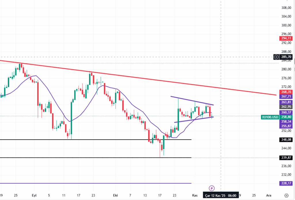 Burada da 8 günlük altında kapanış gerçekleşti. Flamanın altında kapanışla birlikte satış baskısının artması beklenir. 260.37$’ın direnç olmasını beklerim. Aşağıda ise 255 ve 250$’ların destek olması beklenir.