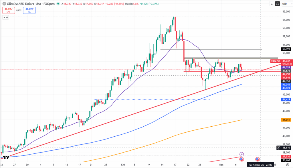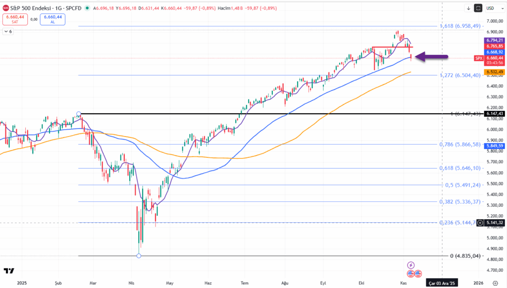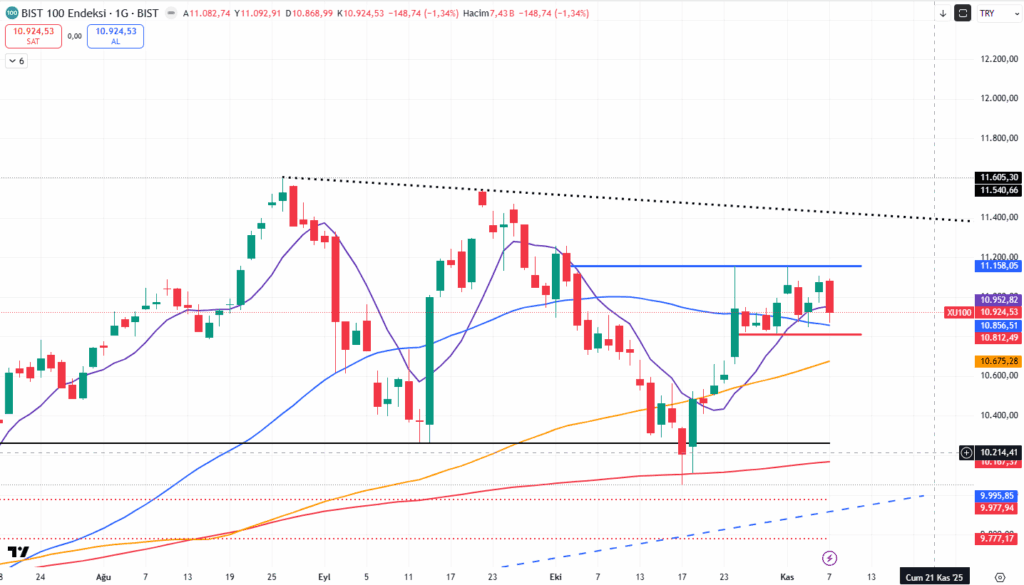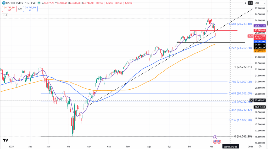 Bu söylediklerimiz harfiyen gerçekleşti ve anlık görünüm şu şekilde. (07.11.2025 saat 21:08) 50 günlük ortalamasının altını test eden endekste 25700 civarından 24600’lere kadar gelindi. 50 günlük altı kapanışta bir sonraki destek 24550’lerden ve bunun ardından 23874’ten geçmekte ancak bu seviyelerin gelmesi bir OBO görüntüsü oluşturacak ve daha aşağıları hedefleyecektir. 25130 üzerine ve ardından 8 günlük hareketli ortalamanın züerine atış bizi rahatlatacaktır. (Anlik 25577)