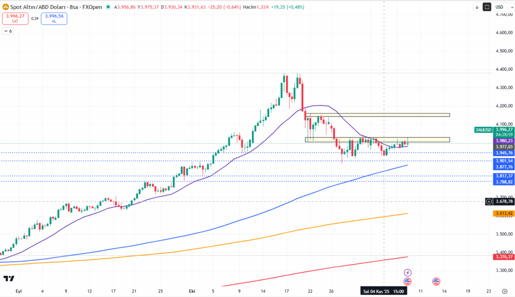 8 günlük ortalamayı zor da olsa kıran altın ise üzerindeki ölü toprağını halen atabilmiş değil ve görüntü zayıf. Aşağıdaki bantın üzerine atabilirse 4140/4160 bandına doğru sert bir hareketlenme beklerim. Ancak 4000/4040 bandının aşılmasını gecikmesi buradan aşağı sert bir mum getirebilir. Sıralı destekleri aşağıdaki görselde mavi kesikli çizgilerin sağ tarafında görmek mümkün.
