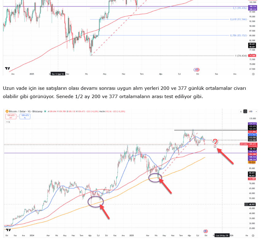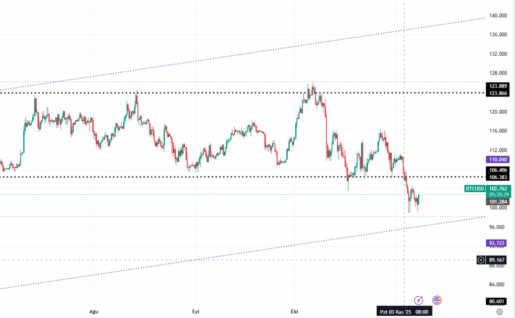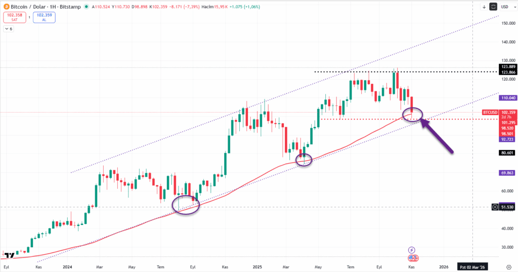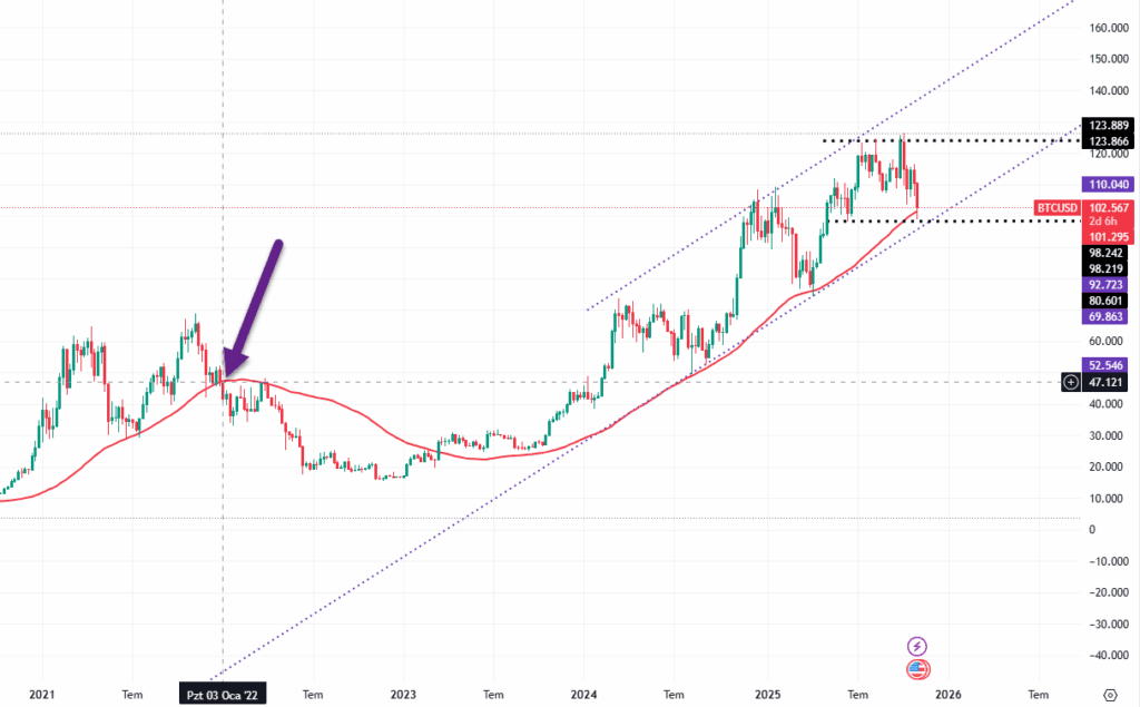 Bir kısa bir uzun vadeli grafik paylaşacağım. Kısa vadelide geçen hafta 106-116 bandının kırılım yönüne dikkat etmeli dedik ve 106 kırılımında çok sert bir şekilde 98bin seviyesine gelindi. Şu anda tekrar 102bin dolar’da olan Bitcoinde 106 üstünde burası için “ayı tuzağı” diyip rahatlayacağız. Uzun vade grafik ise bir altta ve kritik.