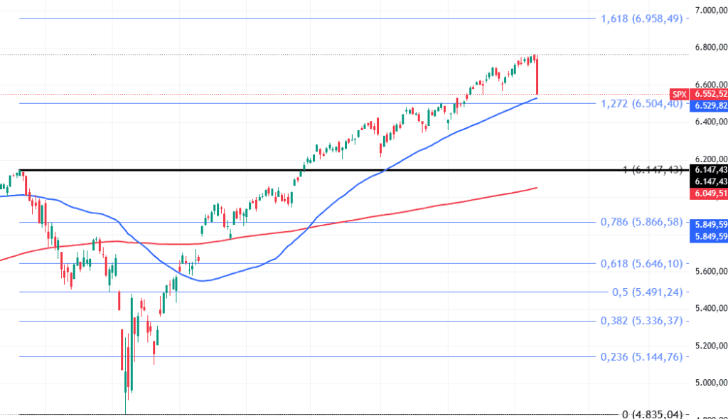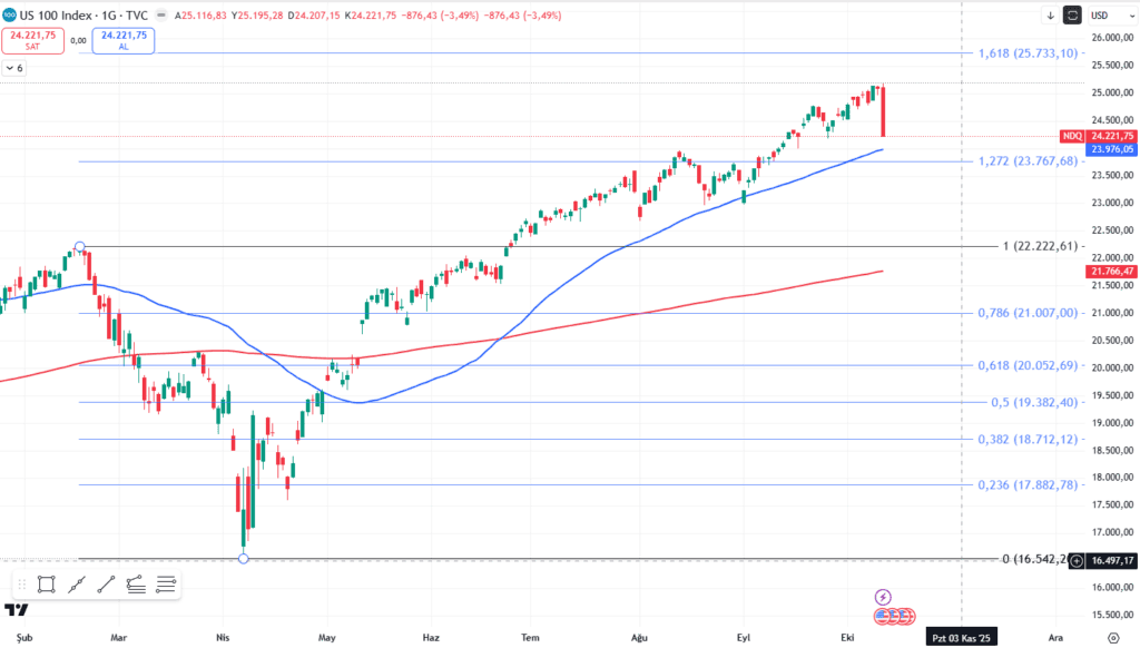 25733 hedefimize az bir yol kalmışken Trump’ın Çin gümrük haberi sonrası son dönemin en sert satışıyla %3.5 düşüşle kapatan endekste 23976(50 günlük) altına sarkıp sarkmayacağını takip edeceğiz. Fibonacci desteği 23767 ve altında 23000 rakamlarını takip edeceğimiz bir hafta olacak.
