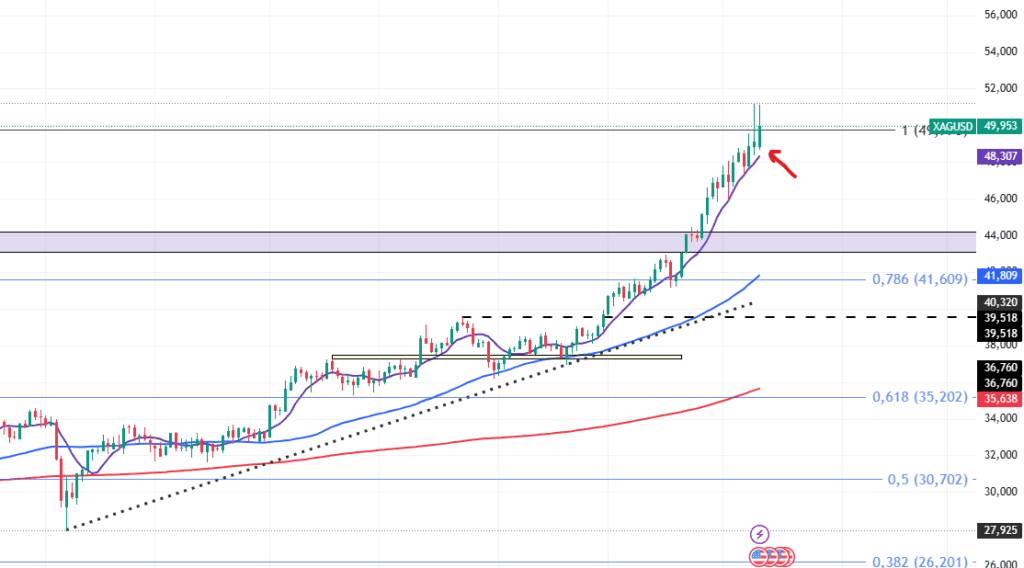 50$’ların üzerini gören gümüş de oldukça sert 2 gün geçirdi ancak 2011 zirvesi olan 49.77$ üzerinde kapatmayı bildi. 50 dolar üzeri hareketler satışla karşılaşsa da 38’den gelen 8 günlük üzerindeki hareketi bir miktar realizasyon için kullanmak adına 8 günlük ortalama altında 2. kapanış beklenebilir, altında tekrar yerine koymak istenebilir.