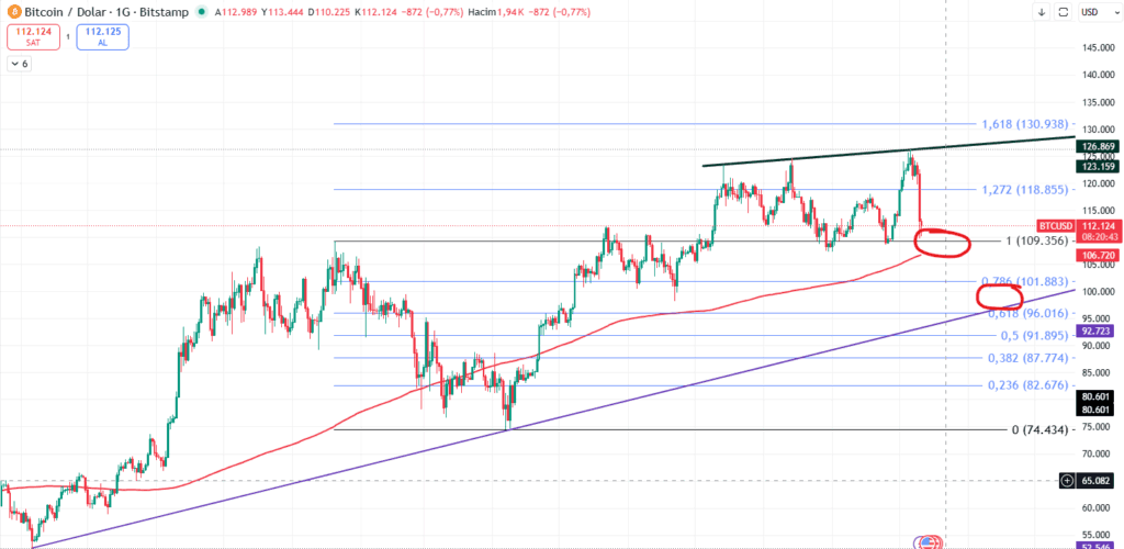 “109.000$ üzerinde kalmak çok ama çok kritik” diye boşuna söylemiyoruz 🙂 Tarihi zirvenin ardından kaos dolu Cuma gecesi yine 109bin sınırından dönüldü 🙂 200 günlük ortalama desteğimiz 106720’den geçmekte. 109.000$ altında olası toplama bölgesi mor yükselen trend üzerindeki 96/100.000$ aralığı olmaya aday. Takibe devam.