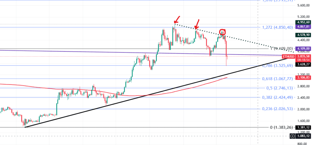 Ethereum bizi üzmedi derken bu hafta fena üzdü maalesef. Pozisyon arttırmak için aşağıda gösterdiğim düşen trendin kırılmasının ardından hemen 2. gün aşağıya inilmesinin ardından spottaki mallarımda stop olduğumun üstünden 3 gün geçmesinden sonra kara Cuma gecesi yaşananlar sonrasında yine büyük düşüş hareketinin Fibonacci 0.786’sından dönüldü.