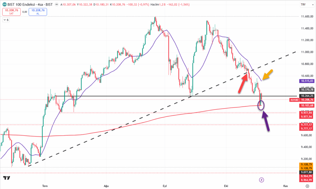 26 Eylül’den beri 8 günlük ortalamamızın altındaki hareket devam ediyor. Geçen hafta kırmızı okla belirttiğimiz trendin kırılımıyla başladığımız hafa oldukça sert geçti ve kırılmasını istemediğim 10264 çizgisi kırıldı, tepki beklediğim 200 günlük şimdilik bunu başarmış görünüyor ancak konuşmak için erken..10103 (200 günlük ortalama) altına sarkma tekrar devam ederse 9977/9777 seviyelerine doğru hareket sertleşebilir. Yukarıda ise 8 günlük ortalama 10515’ten geçiyor ve belki hafta buraya doğru bir tepki ile başlayabilir.