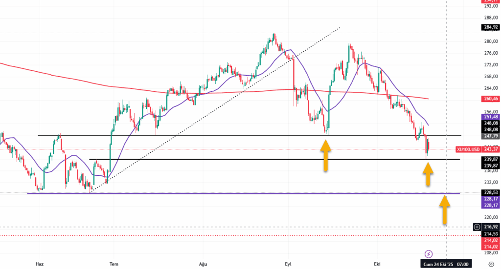 Dolar bazlı ise “kritik” dediğimiz 248$’ın kırılmasının ardından aşağı doğru ivmelenen harekette soluğu 240½’da aldık ama hafta başı buradan terkrar 245/248 arasına tepki beklenebilir. Bir altta ise 228$ bulunuyor..
