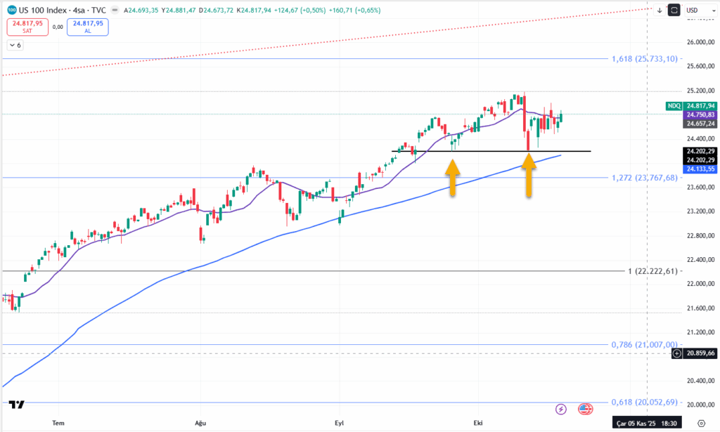 25733 hedefine doğru giderken buradaki yatay harekete dikkat etmek gerekiyor. 24200’lerden geçen bir yatay destek gözlemlenirken24750’yi de yatay olarak düşündüğümüzde “Acaba bir OBO mu oluşuyor?” sorusu gelmeye başladı aklıma. Bunun iptali için haftaya 24750’nin üzerine doğru yükselmeye devam etmemiz lazım. 25200 eski zirve seviyemiz de yeniden direnç olacaktır. Desteklerimiz ise konuştuğumuz 24200 ve 24133’ten geçen 50 günlük ortalama.