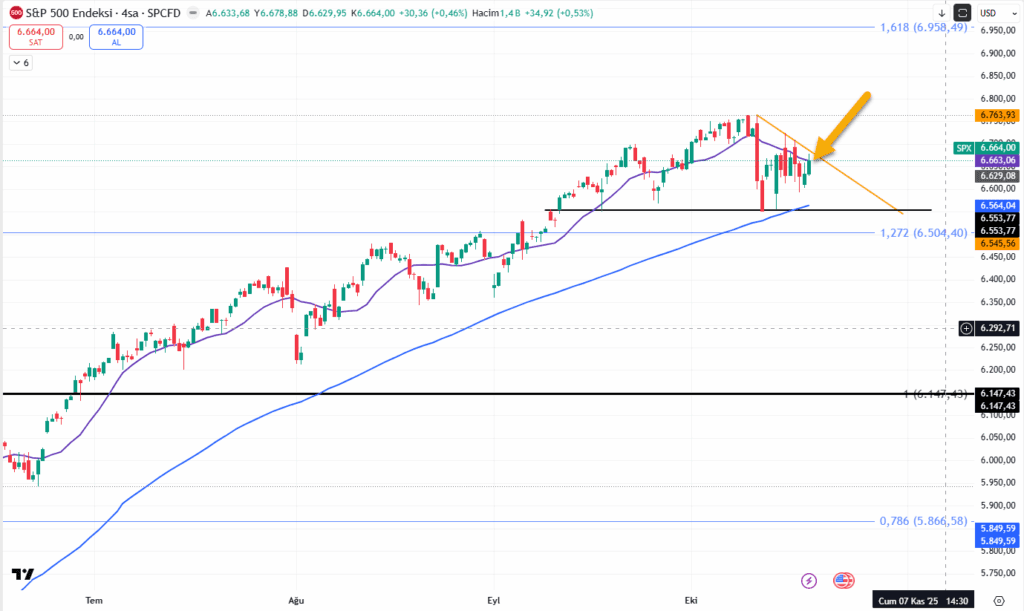 Bu endekste de 50 günlük ve sarı düşen trend arasında sıkışma devam ediyor. Destek bölgesi 6550/6564 arasında iken sarı düşen trend ve 8 günlük 6664 seviyesinin aşılmasıyla yeni dirençler 6700/6765 olacak.