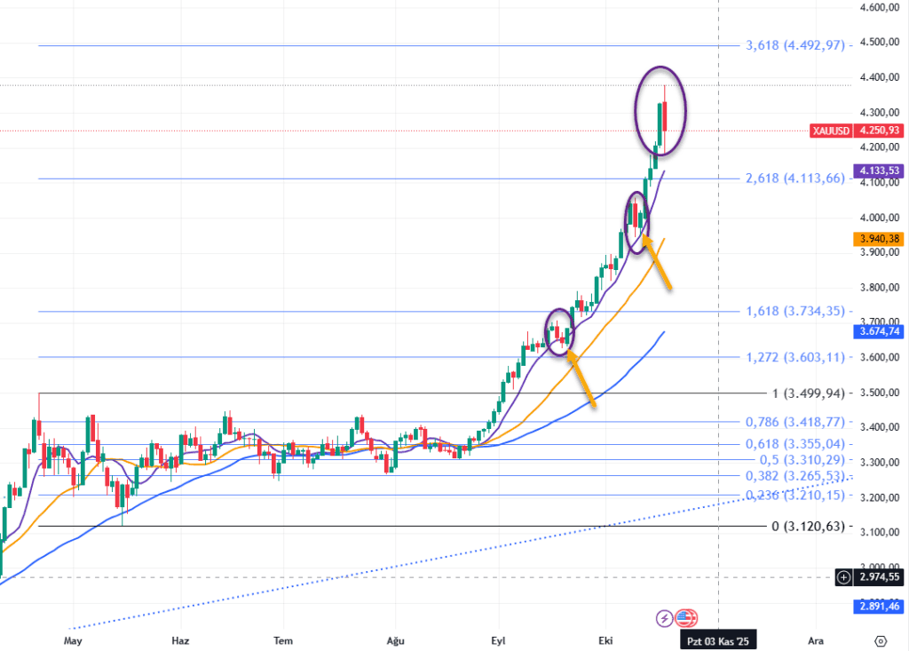 Altın altın altın.. Sarı fırtına. Sarı kız. Ne derseniz diyin 🙂 Haftanın son gününde önce yukarı sonra aşağı sert bir inişle kapatmasına rağman haftayı%5’in üzerinde kazançla geçirdiğini unutmayalım. Grafikte 3440$ sonrası gerçekleşen parabolik hareketin yine şüphe uyandırdığı kısa düzeltmelerini mor yuvarlaklar içine aldım. Kendinize ister yukarı ister aşağı hareketlerde “şu olursa şunu yapacağım” dediğiniz bir yol çizin ve ona uyarak devam edin. Benimki 8 günlük ortalama altında ikinci kapanış ile stop olmak ya da 8 ortalamadan çok sert yukarı kopşularda(Cuma günkü gibi) karın bir kısmını realize etmek. Bu tip aşırı trendlerde ralli-taban oluşumu-ralli gereksinimi gereği bir yerlerde Nisan-Eylül arası gibi(o kadar uzun olma ihtiyacı yok) bir güç toplama evresi beklenebilir. Önümüzdeki hafta bunlardan biri olmaya aday ama dediğim gibi kendi stratejinizi geliştirin ve kimseyi dinlemeyin…