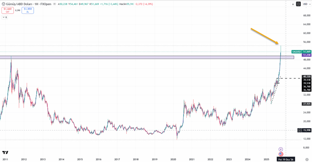 1.’si teknikçilerin trendlerde en sevdiği yer olan “uncharted territory” yani grafikte sol tarafı boş olan ve nerede biteceğini kimsenin bilemeyeceği bir olası trend bölgesinde olmamız. Bunun stop noktası tabii ki eski zirve seviyesi altında haftalık bir kapanış ancak gümüş o kadar volatil ki(Cuma günkü zirve/dip arası %7.12) bir haftalık harekete yürek dayanmaz 🙂