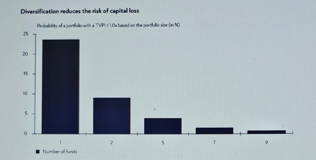 Ayrıca, farklı uzmanlıklara sahip yöneticilerle yatırım yapmayı düşünmek de faydalıdır; böylece birden fazla değer yaratım kaynağından yararlanılabilir. Aşağıdaki grafikte görüldüğü üzere, yalnızca tek bir PE fonundan oluşan bir portföyün TVPI (toplam değer / ödenen sermaye) oranının 1,0x’in altında olma olasılığı %23,6’dır; bu, yatırımcının zarar yazmasının beklendiği anlamına gelir. Buna karşılık, dokuz PE fonundan oluşan bir portföyde bu olasılık %0,7’ye düşmektedir. Bu da çeşitlendirmenin sermaye kaybı riskini azalttığını göstermektedir.