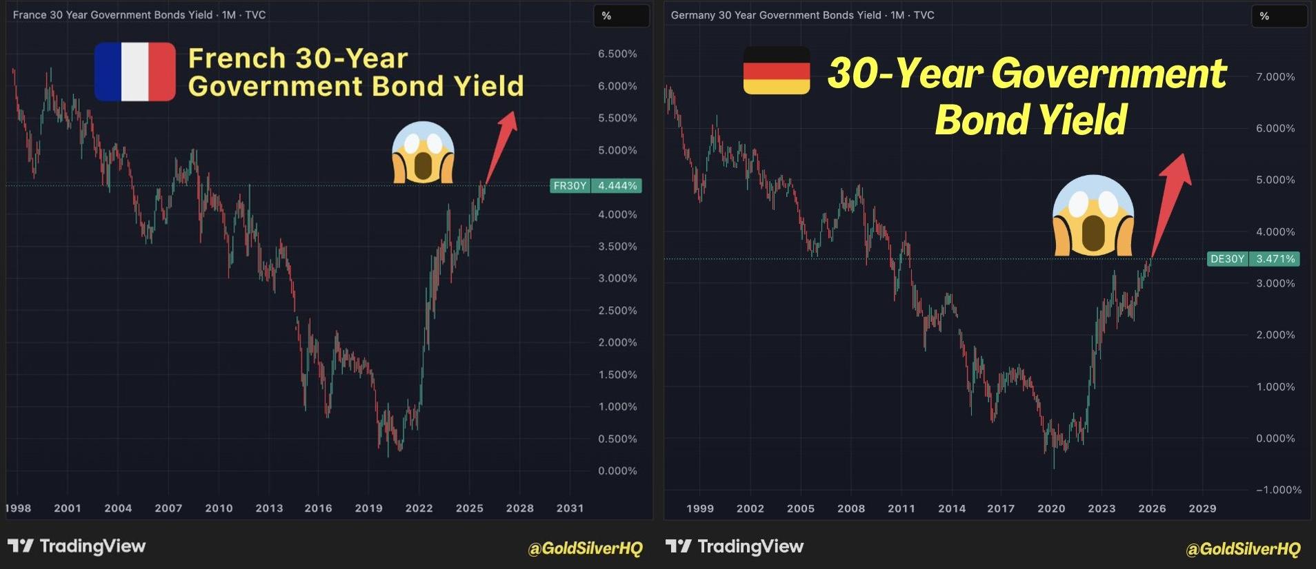 Avrupa’nın iki büyük ekonomisi Almanya ve Fransa’da 30 yıllık devlet tahvili getirileri, neredeyse 15 yılın zirvesine fırladı. Grafiklerde açık şekilde görüldüğü gibi, Almanya’nın uzun vadeli getirisi %3,47, Fransa’nın ise %4,44 düzeyine çıkarak 2009–2011 bandının üzerine dayanmış durumda.