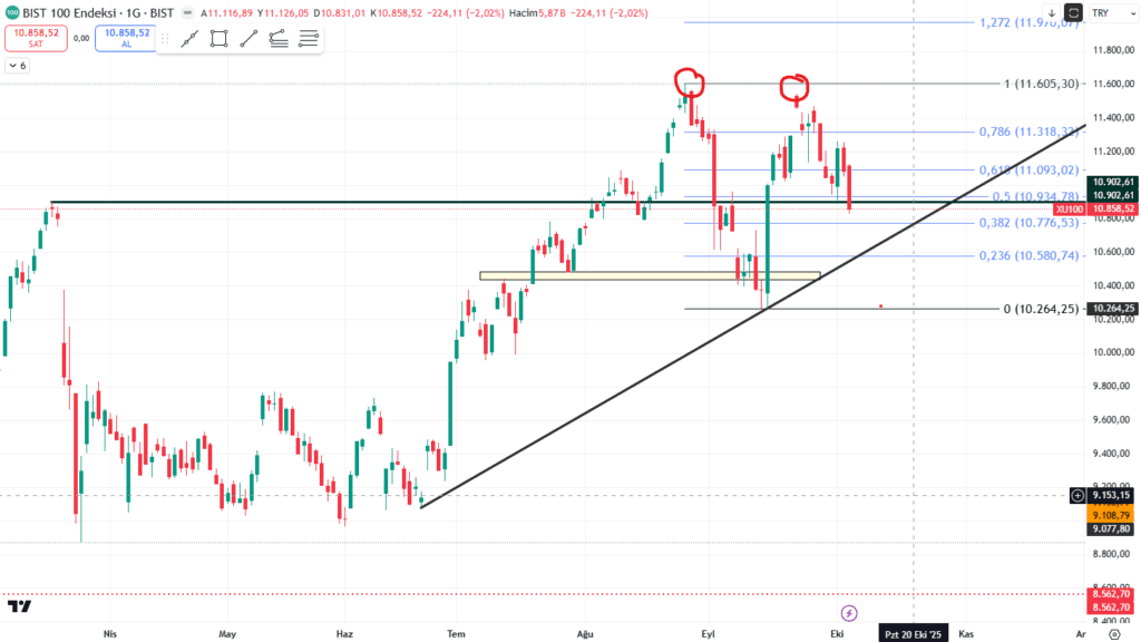 Borsamızdaki teknik durum pek iç açıcı görünmüyor. Enflasyonun beklenti üstü gelmesi ve bir takım dedikodular(Artunç Hoca’nın yayınlarında yeterince geçiyor o yüzden tekrarlamıyorum) Cuma günü sert BIST100’ün satışlarla kapanmasını sağladı. Grafikte işaretli yuvarlaklarda daha zayıf bir 2li tepe riskini masaya getirse de bunun için önce siyah yükselen trendin ardından da 10264’teki boyun çizgisinin altına sarkılması lazım. Umarız 11000 puanın üzerine hızla dönülür. aksi taktirde zayıflık devam edecek gibi görünüyor.