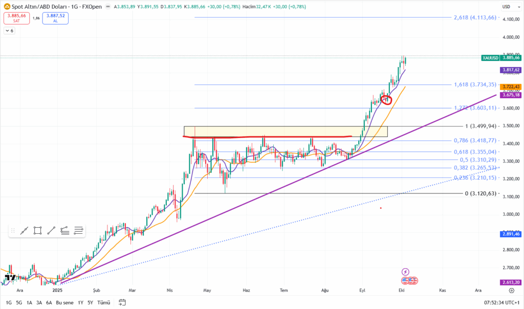 4113$ hedefi için bir önceki hedefimiz 3734$’ın üzerindeki hareket devam ediyor. 4113 hedefi için 3817$ 8 günlük altında 2. kapanış bir müddet kenarda oturmayı gerektirebilir ve yeni bir konsolidasyon başlayabilir.