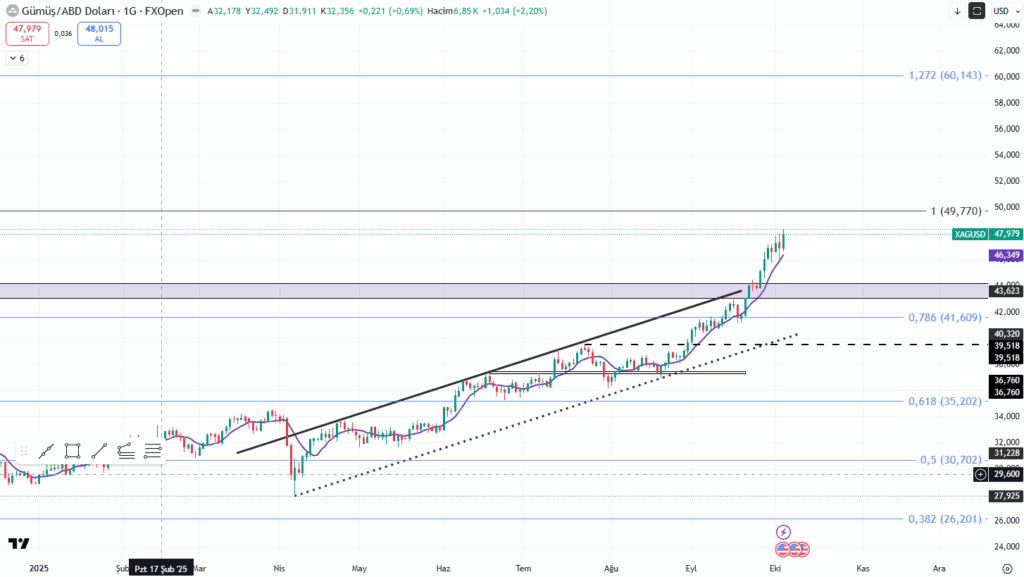 45$ hedefinin de üzerine çıkmayı başaran gümüşte 8 günlük ortalama altında 2. kapanış gelmeden 38$’dan 48$’a kadar geldik, yine bu ortalamayı takip etmekte fayda görüyorum. Anlık olarak 46.35$ 8 günlük ortalamamız. Altında 2. kapanış için alarmlarınızı bu ortalamaya kurun derim.