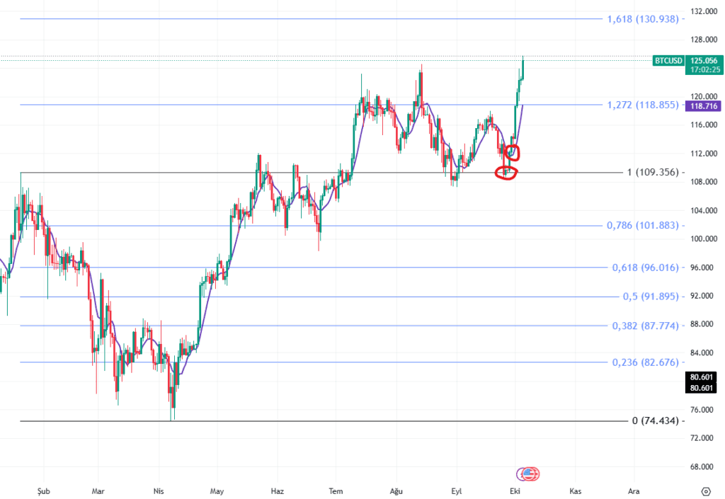 “109.000$ üzerinde kalmak çok ama çok kritik” dediğimiz haftaya 109.000 üzerinde tutunarak başlayan Bitcoin 8 günlük üzerine attıktan sonra ivmelendi ve 5 Ekim 9.58 itibariyle 125.056$ ile tarihinin en yüksek seviyesinde bulunuyor. İlk hedefimiz 130938$’da ancak tanımsız bölgeye girdiği için bir önceki zirve seviyesi 124644$ seviyesine stop koyarak nereye kadar gideceğini izlemek kısa vadeli iyi bir trade seçeneği olabilir.