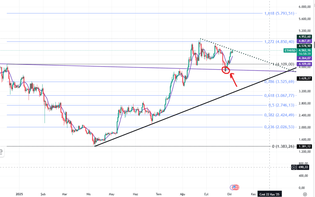 Ethereum da bizi üzmedi ve geçen hafta grafikte belirttiğimiz yeri(kırmızı daire) onay olarak kullanmış gibi görünüyor. ilk hedef yeniden 4850$ ardından tarihi zirve ve 5793$ olacak.