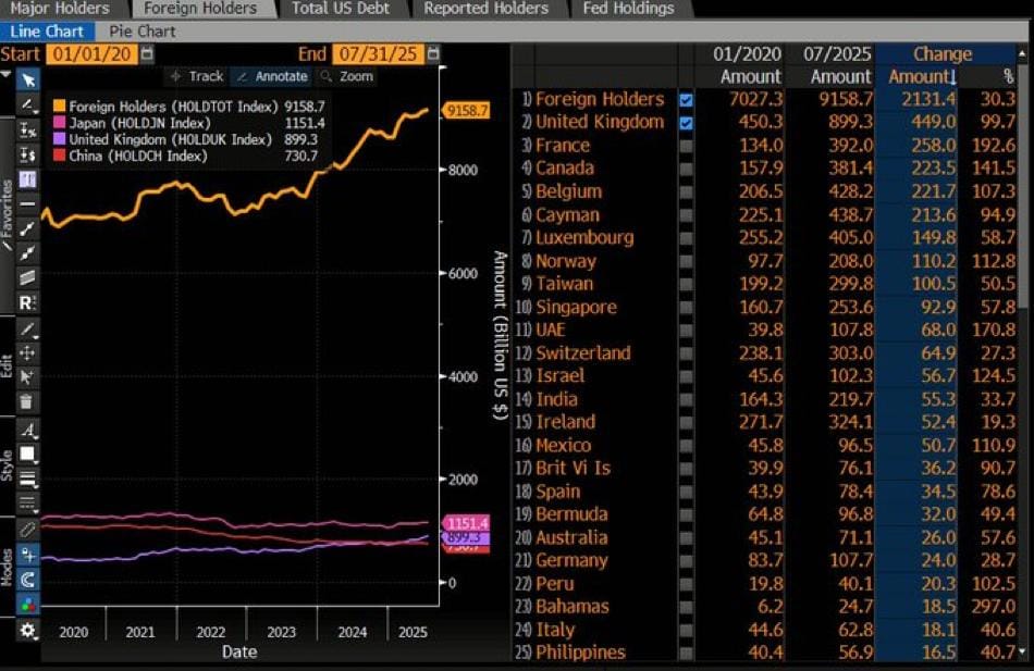 - Toplam yabancıların elindeki ABD tahvilleri Ocak 2020’de 7.027 trilyon $ iken Temmuz 2025’te 9.158 trilyon $’a çıkmış. Yani 5,5 yılda yaklaşık 2,13 trilyon $ artış.
