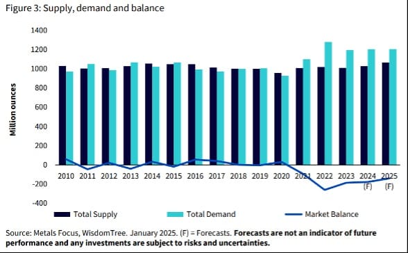 Grafikte 2010–2025 dönemine ilişkin gümüş arzı (supply), talebi (demand) ve piyasa dengesi (market balance) gösteriliyor. Kaynak Metals Focus, WisdomTree, Ocak 2025.