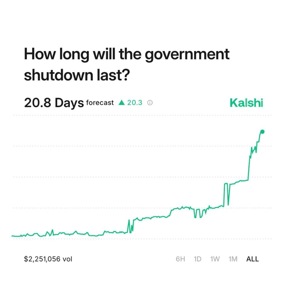 - Piyasa tahmin platformu Kalshi, hükümetin kapanmasının ortalama 20,8 gün, yani yaklaşık 3 hafta süreceğini öngörüyor.