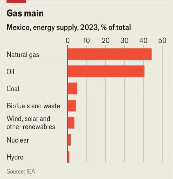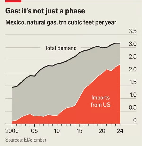 ABD’nin Teksas eyaletinde üretilen ucuz doğalgaza kolay erişim, Meksika için büyük avantaj oldu. Ancak bu düzenleme, Başkan Claudia Sheinbaum için siyasi açıdan sıkıntılı. 21. yüzyılın başına kadar ülke tüm doğalgazını kendisi üretiyordu. Talep Pemex’in üretimini aşınca, 2009’da arz zirveye ulaşıp kesintiler yaşandığında, Teksas’taki kaya gazı patlaması çözüm sundu. Yeni boru hatları inşa edildi, devlet elektrik şirketi CFE kombine çevrim santrallerinde üretimi artırdı.