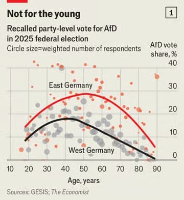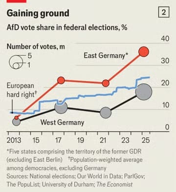 Almanya genelinde de benzer bir tablo var. AfD, uzun zamandır daha gevşek parti bağlılıklarının olduğu doğuda daha başarılı oldu. Ancak ulusal düzeyde rekor kırdığı Şubat seçimlerinde bile, doğuda batıya kıyasla daha hızlı büyüdü. Son anketler, örneğin Saksonya-Anhalt’ta AfD’yi olağanüstü %39’a koyuyor. Parti, gelecek yılki eyalet seçiminde mutlak çoğunluk kazanmayı hedefliyor. Batı Almanya’daki gücü ise Avrupa’nın diğer aşırı sağ partileriyle benzer bir seviyede.
