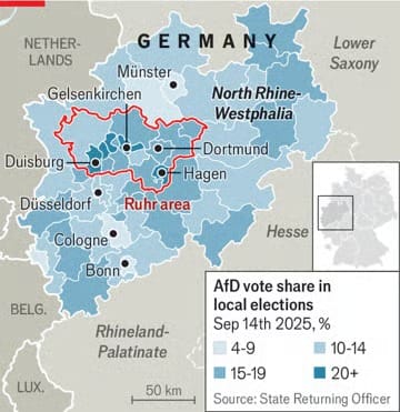 Şubat ayındaki genel seçimlerde Gelsenkirchen, eski komünist Doğu Almanya eyaletleri dışındaki iki şehirden biriydi ki AfD burada birinci oldu (diğeri Palatina’daki talihsiz Kaiserslautern). AfD, NRW yerel seçimlerinde eyalet genelinde Şubat’a kıyasla biraz daha düşük performans gösterse de Gelsenkirchen’de oylarını beş puan artırdı. Ruhr’un diğer kentlerinde de benzer bir tablo vardı: AfD adayları üç yerde belediye başkanlığı için ikinci tura kaldı.