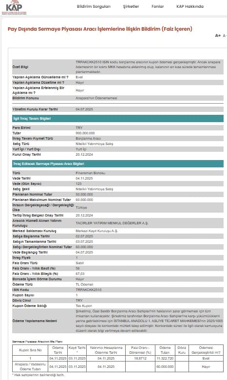 ● Ancak anapara ödemesinin yalnızca bir kısmı Merkezi Kayıt Kuruluşu’na (MKK) aktarıldı; kalan kısmın kısa sürede tamamlanması planlanıyor.