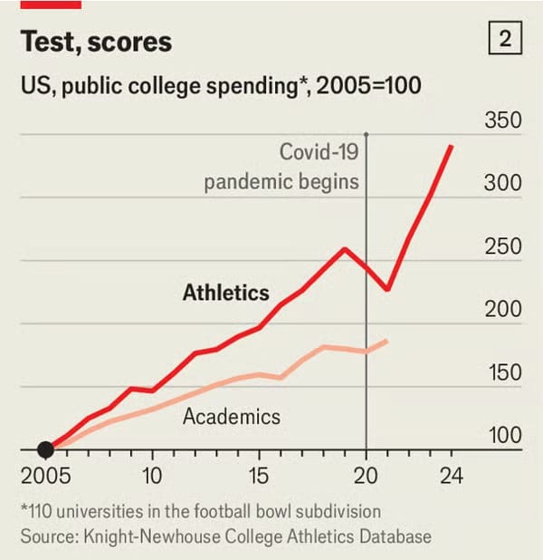 Halihazırda, üst düzey spor programlarına sahip kamu üniversitelerinin yaklaşık %70’i spor departmanlarını desteklemek için akademik fonları kullanıyor. 2024’te bu en üst bölüme ait 110 kamu üniversitesinden sadece 18’i spor gelirlerinin giderlerini aştığını bildirdi. Son yirmi yılda spor departmanlarının harcamaları %244 artarken, akademik harcamalar yalnızca %113 arttı.