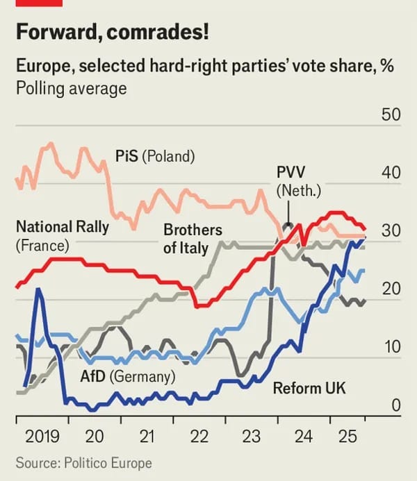 Tek bir etken aşırı sağın başarısını açıklamıyor, ancak Avrupa’nın ekonomik sıkıntıları buna yardımcı oldu. Enflasyon, kamu hizmetlerindeki kesintiler ve pahalı yeşil dönüşüm bu yükselişi besliyor. İyimser olmak için nedenler az: öngörüler, kıtanın üretiminin yakın zamanda yılda %1’in biraz üzerinde büyüyeceğini gösteriyor. Almanya’nın ekonomisi, hükümetin mali kuralları gevşetmesine rağmen, durgun. ABD, AB’den ithalata %15 gümrük vergisi koydu ve bu kolayca artabilir. Çin’den gelen ucuz ürünler Avrupa işletmelerini tehdit ediyor. Bu sırada emeklilerin sayısı artıyor, doğum oranları düşüyor.