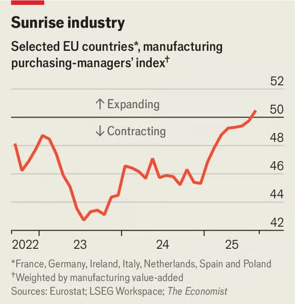 Yüzeyde bakıldığında Avrupa ekonomisi kasvetli bir durumda. IMF, kıtanın en büyük üç ekonomisi olan Almanya, Fransa ve İtalya için bu yıl ortalama yalnızca %0,4 büyüme öngörüyor; 2026’da ise ancak %1’e yaklaşacağını tahmin ediyor. 8 Eylül’de Fransa hükümeti, ülkenin aşırı bütçe açığını nasıl kapatacağına dair anlaşmazlıklar yüzünden düştü ve ülkenin gösterge tahvil getirileri, 1999’da euronun yaratılmasından bu yana ilk kez İtalya’nın seviyesine çıktı. ABD Başkanı Donald Trump gümrük tarifeleri uyguluyor, Ukrayna’daki savaş sürüyor ve Çin’in ticari rekabeti giderek daha korkutucu hale geliyor.