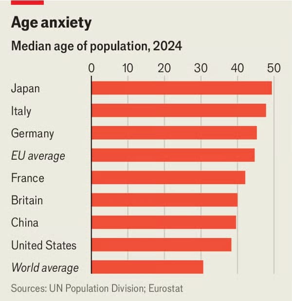 Avrupa nüfusu hızla yaşlanıyor. Kıtanın ortanca yaşı 43; dünya ortalaması 31. 2050’ye gelindiğinde, AB nüfusunun %6’sı 85 yaşın üzerinde olacak; bu oran bugünkü seviyenin iki katından fazla. Batı Avrupa ülkeleri, özellikle Almanya görece daha iyi durumda. Asıl sorun, nüfusu daha yaşlı olan ve gençlerin hızla göç ettiği güney ve doğu Avrupa’da. Avrupa’nın en yaşlı ülkesi İtalya’da ortanca yaş 49. Yalnızca 2021’de, 25–34 yaş arası üniversite mezunlarının %2,8’i göç etti. Yunanistan, Litvanya ve Letonya gibi benzer şekilde yaşlı ülkelerde ise 2023–2050 arasında çalışma çağındaki nüfus %20 azalacak.