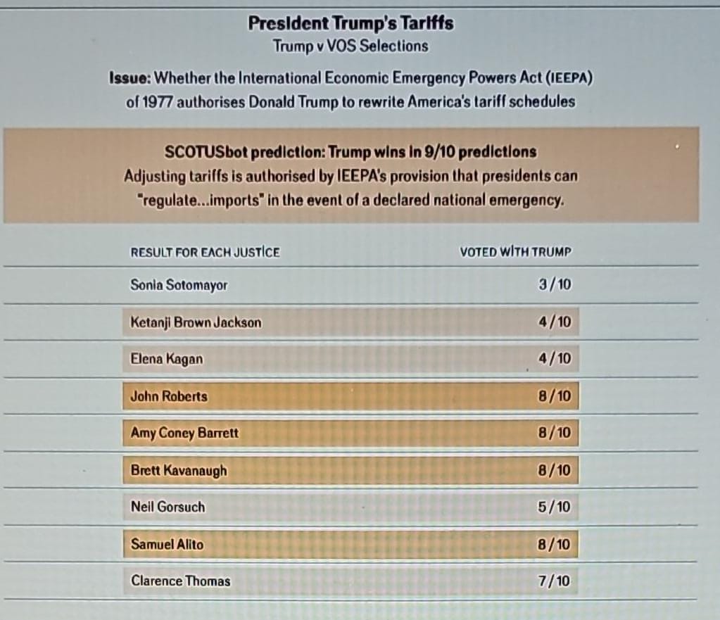 The Economist’in Yüksek Mahkeme kararlarını tahmin eden yapay zekâ aracı SCOTUSbot, Trump’ın tarifelerinin onaylanacağını öngörüyor. On simülasyonun dokuzunda başkan 5-4, 6-3 veya 7-2 oy oranıyla galip geliyor. IEEPA’nın genişletilmiş yorumunun iki partiden de destek bulabileceği belirtiliyor: Cumhuriyetçi yargıçlar genellikle başkanlara (özellikle Cumhuriyetçi olanlara) geniş yetki tanırken, Federal Temyiz Mahkemesi’nde Obama tarafından atanmış iki yargıç da Trump’tan yana tavır aldı — bunlardan biri muhalefet şerhini yazan Yargıç Richard Taranto’ydu. Trump’ın otomobil, bakır ve mobilya gibi ürünlere koyduğu diğer tarifeler ise IEEPA’ya değil, 1962 tarihli Ticaretin Genişletilmesi Yasası’nın 232. Bölümü ile 1974 tarihli Ticaret Yasası’nın 301. Bölümüne dayanıyor; dolayısıyla risk altında değiller.