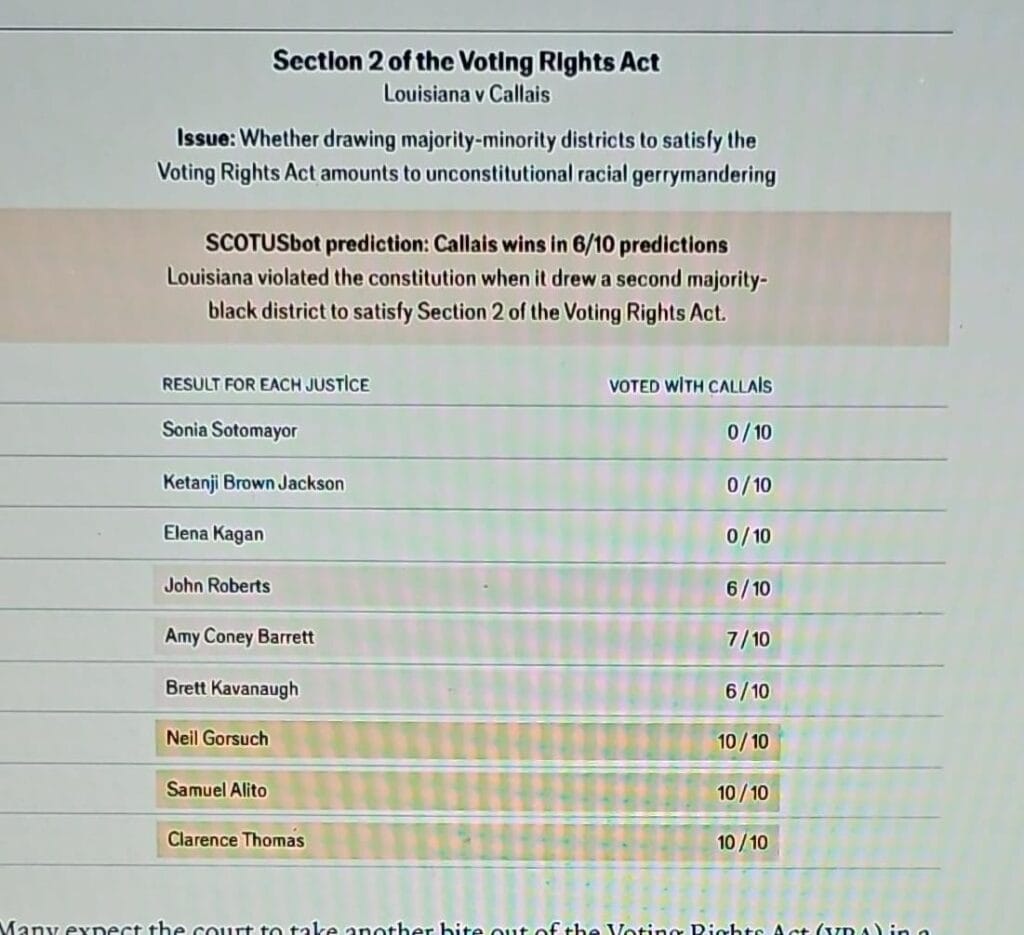Birçok kişi, mahkemenin Oy Hakları Yasası’nı (VRA) yeniden zayıflatmasını bekliyor. Bu kez dava, Louisiana’da ikinci çoğunluğu siyah seçmenlerden oluşan bir kongre bölgesinin oluşturulmasına karşı açıldı. Eğer bu itiraz başarılı olursa, daha fazla seçim çevresi manipülasyonunun (gerrymandering) önünü açabilir. Ancak SCOTUSbot temkinli: Louisiana v Callais davasının on simülasyonundan dördünde, yeniden çizimi zorunlu kılan VRA’nın 2. Bölümü yürürlükte kaldı. Gelecek yılki ara seçimlerin çekişmeli geçmesi beklenirken, Demokrat eğilimli Temsilciler Meclisi bölgelerinin kaybını önleyecek bir karar, Demokratlar için aksi halde sert geçecek bir dönemde teselli niteliğinde olabilir.