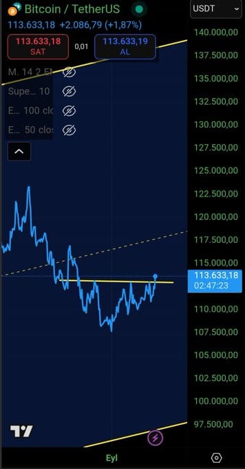 Bitcoin, haftanın kritik teknik seviyelerinden biri olan 113.000 dolar direncini test etti. Grafikte görüldüğü üzere bu seviyenin üzerinde kalıcılık sağlanması halinde yükselişin bir sonraki durak olan 117.650 dolara kadar devam etmesi bekleniyor. Bu bölge, yatırımcılar için kısa vadede “karar anı” niteliği taşıyor.