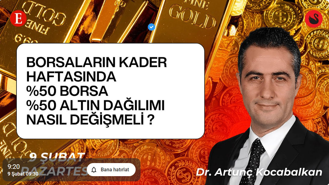 Dr. Artunç Kocabalkan, haftanın en kritik piyasa başlıklarını “Borsaların Kader Haftası” çerçevesinde değerlendirecek. Artan küresel belirsizlik, algoritmik satış baskısı ve volatilite eşliğinde %50 borsa – %50 altın dağılımının nasıl revize edilmesi gerektiği, risk yönetimi ve korunma stratejileriyle ele alınacak. Yayında, kısa vadeli dalgalanmaların portföy dengesi üzerindeki etkileri ve yatırımcıların hangi senaryolara karşı pozisyon alması gerektiği masaya yatırılacak.