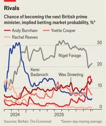 Buna karşılık, Maliye Bakanı Rachel Reeves ya da Muhafazakâr Parti lideri Kemi Badenoch için şans neredeyse yok denecek kadar düşük görülüyor.