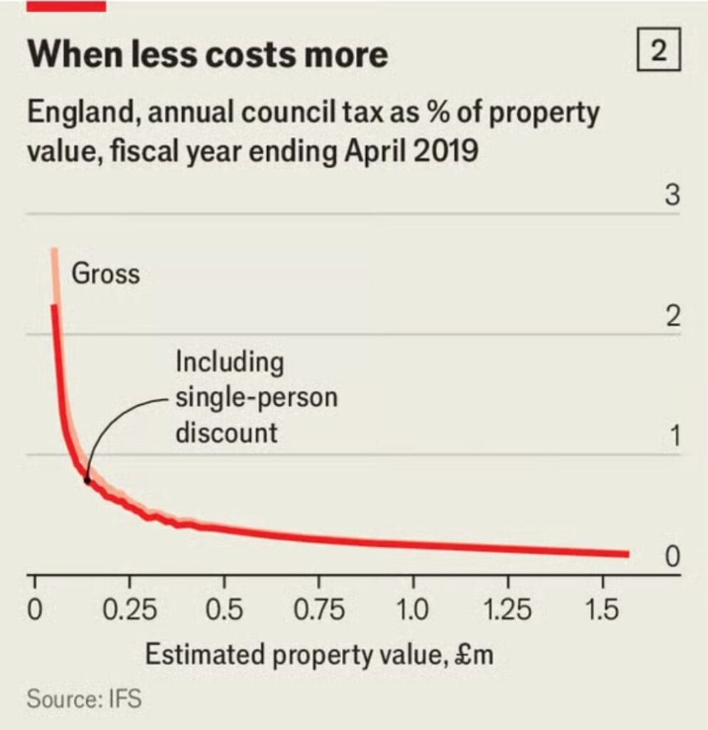 Mevcut belediye vergisi (council tax), 1991’deki piyasa değerine göre belirlenen A’dan H’ye sekiz bant üzerinden alınıyor. Daha o zaman bile zenginleri kayırıyordu: H bandındaki evler A bandındakilerden sekiz kat değerliydi, ama sadece üç kat fazla vergi ödüyordu. Bugün çarpıklık uçurum haline geldi. Hartlepool’da iki odalı dairenin (bant C) yıllık vergisi 2.218 sterlin; Westminster’da on odalı malikânenin (bant H) vergisi ise 2.034 sterlin.