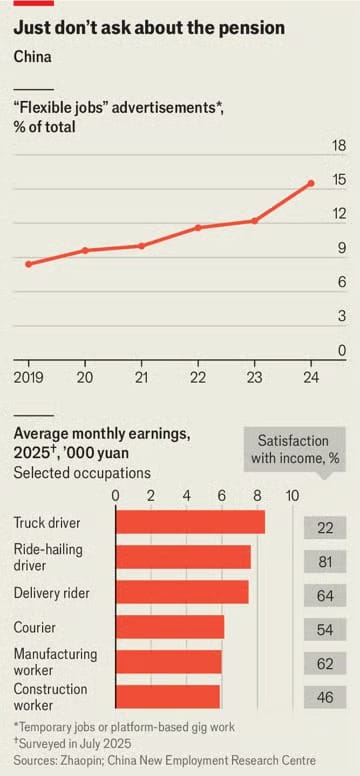 Ağustosta Çin Yüksek Mahkemesi, işverenleri tarafından hakları reddedilen işçilerin tazminat talep edebileceğine hükmetti. Bu, gig işçilerini kullanan ve ekstra maliyeti karşılayamayacak küçük şirketleri şoke etti. Ancak kararın nasıl uygulanacağı belirsiz. Daha büyük mesele ise onlarca yıldır insanların hareketini kontrol etmek için kullanılan “hukou” sistemi. Son reformlar, resmî çalışanların şehirlere yerleşmesini kolaylaştırıyor, ancak gig işçileri için hiçbir şey yapmıyor.