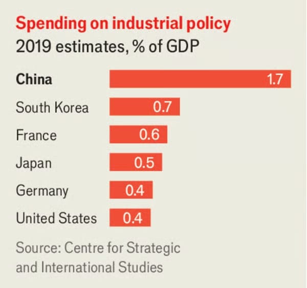Sanayi sübvansiyonları, doğrudan ve dolaylı olarak, 2019’da Çin’e GSYİH’sının %1,7’sine mal oldu; bu oran devlet müdahalesiyle bilinen Fransa’da %0,6 idi. Ülke genelinde 2.000’den fazla devlet yönlendirmeli yatırım fonu var; toplamda 10 trilyon yuan (1,4 trilyon $) toplamayı hedefliyorlar. Bu büyük bir inovasyon potansiyeli yaratabilir, ama özel girişim sermayesini kurutuyor. İsraf ve yolsuzluk da cabası: “Büyük Fon” adıyla bilinen yarı iletken fonu, büyük yolsuzluk skandallarıyla gündeme geldi; en az bir düzine kişi soruşturuldu ya da tutuklandı.