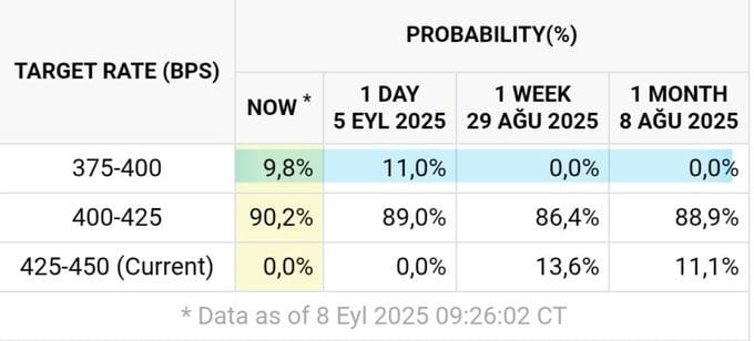 CME FedWatch verileri de bu ihtimalin fiyatlara yansıdığını gösteriyor. Bir hafta önce sıfır olan 50 baz puanlık indirim olasılığı, 8 Eylül itibarıyla %9,8’e yükseldi. Piyasa hâlâ en güçlü ihtimal olarak 25 baz puanlık indirimi görüyor (%90,2), ancak “jumbo” indirim seçeneği de artık radarına girmiş durumda.