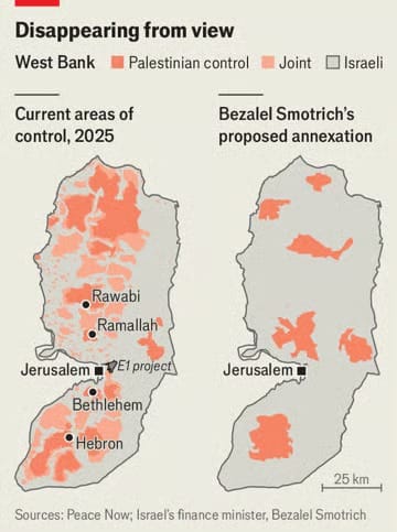 Vizyon ile gerçeklik arasındaki uçurum bundan daha geniş olamazdı. Britanya, Fransa ve diğer bazı devletler—ama Amerika değil—Filistin devletini resmen tanımanın eşiğinde. Sahadaysa söz konusu devlet giderek görünmez hale geliyor. İsrail ordusu Gazze’yi işgal edilmiş bir harabeye çevirdi. İsrail Maliye Bakanı Bezalel Smotrich, Filistin yönetimini ayakta tutan vergi gelirlerini kesiyor. 3 Eylül’de açıkladığı haritada kendi ilhak vizyonunu sundu. Haritada, İsrail’in 1967’de işgal ettiği Batı Şeria’nın yalnızca %18’i dışında her yeri kontrol ettiği ve Filistin’in şehirlerini altı ayrı adacığa indirgediği görülüyordu.