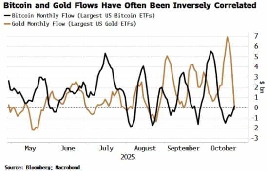 • Bitcoin ve altın fonlarındaki para girişleri ters yönde hareket ediyor — dijital altın ile fiziksel altın arasındaki zıt akış yeniden güçlendi.