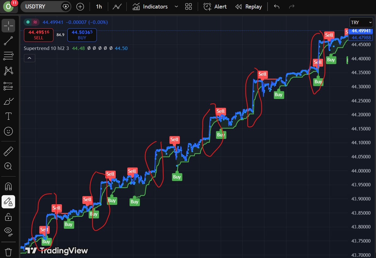 Dolar/TL kurunda son dönemde dikkat çeken en kritik gelişme, teknik göstergelerin verdiği satış sinyallerine rağmen yükseliş trendinin bozulmaması. Paylaşılan grafikte Supertrend göstergesinin sık sık “sell” sinyali üretmesine rağmen kurun her geri çekilme sonrası yeniden yukarı yönlü hareketine devam ettiği açık şekilde görülüyor.