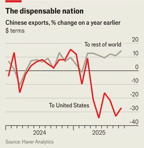 Ülkelerinin zayıflıklarını hafife alan Amerikalı yetkililer Çin’inkileri ise abartıyor. Doğru, Çin düşük talep ve kalıcı deflasyonla boğuşuyor. Fabrika çıkış fiyatları eylülde yıllık bazda art arda 36. kez düştü. Bu yılki büyümesi de ihracatla desteklendi. Ancak bu, Çin’in Amerikan pazarına ezici şekilde bağımlı olduğu anlamına gelmiyor.